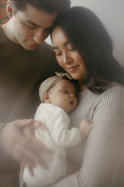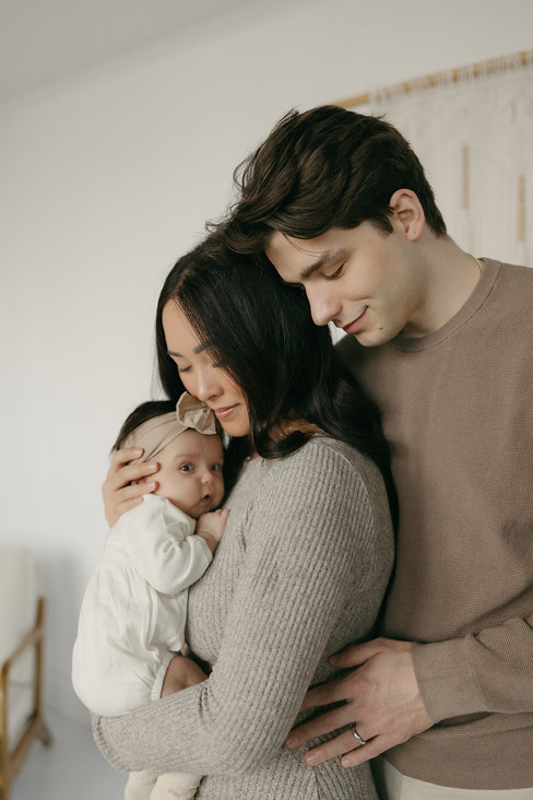One of the things I loved most about this session was how simple and intentional it felt. The soft natural light, the neutral tones, and the clean studio setting gave everything so much room to breathe. Nothing felt rushed or overly styled. Instead, the focus stayed exactly where it belonged — on the connection between these new parents and their baby, and on all the tiny, tender moments that make this chapter so unforgettable.